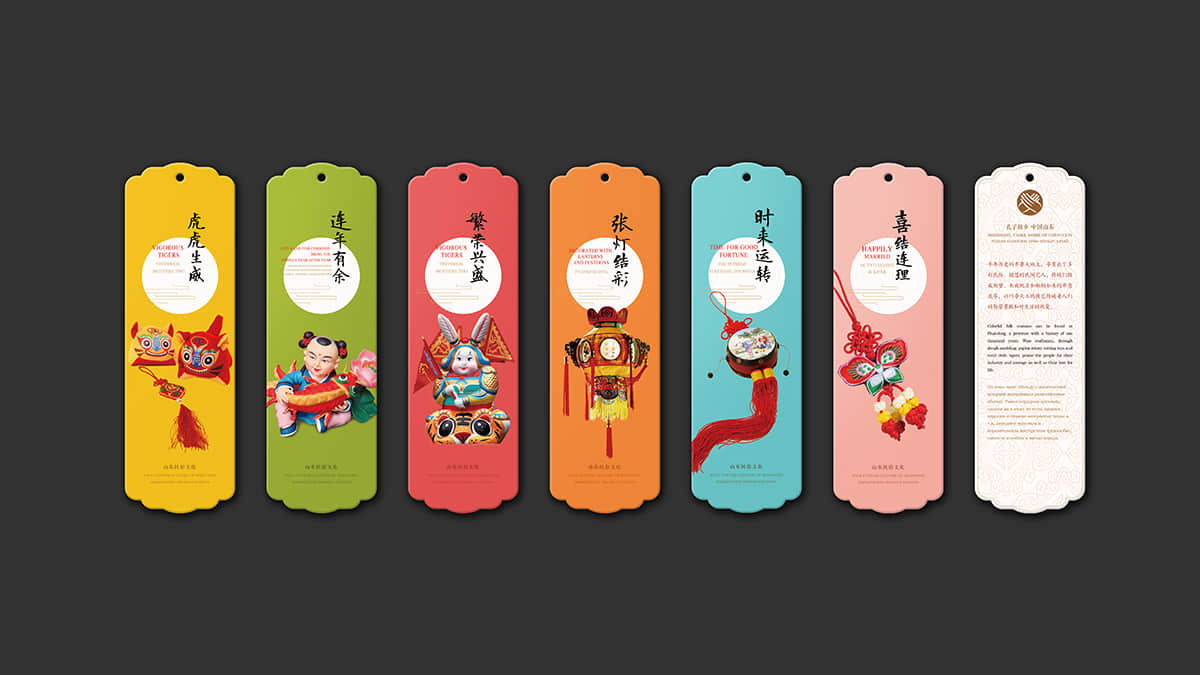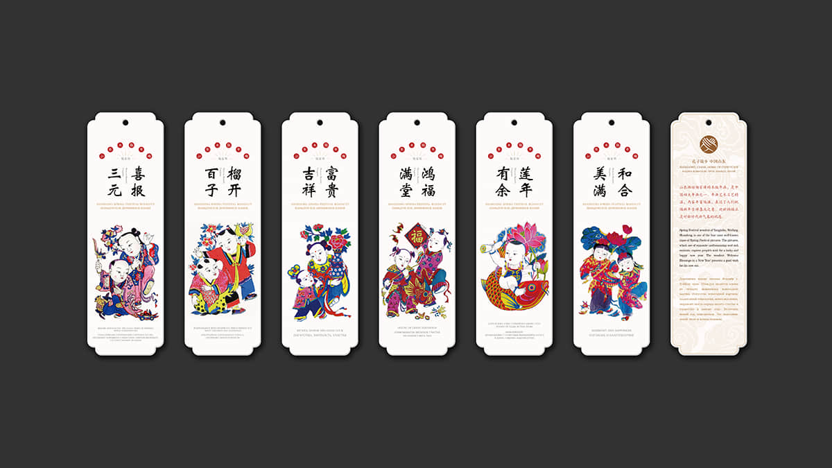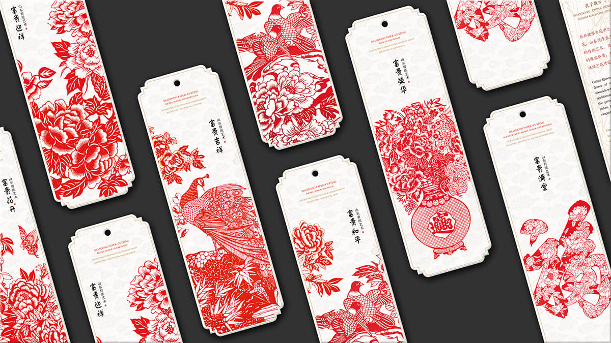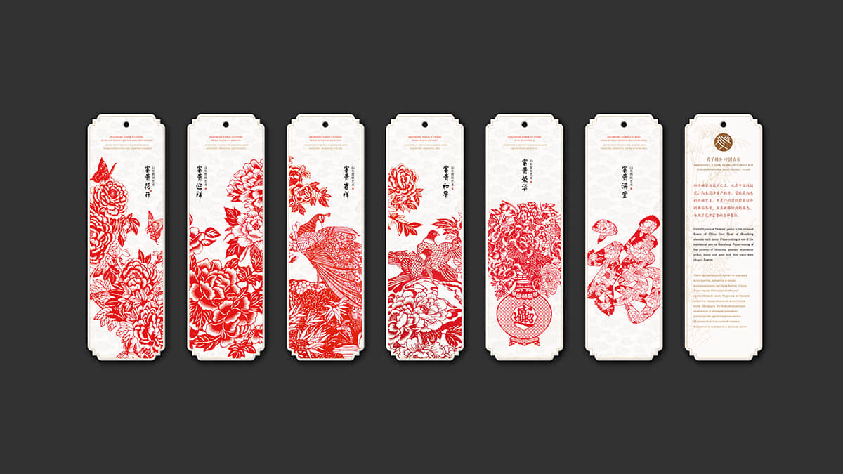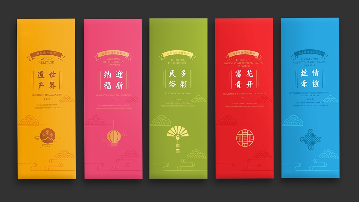 整套書簽總共分為世界遺產(chǎn)、迎新納福、多彩民俗、花開富貴和情誼絲牽五個(gè)系列,分別以世界遺產(chǎn)、山東木板年畫、山東民俗文化、山東剪紙藝術(shù)和山東濰坊風(fēng)箏為主題,每個(gè)主題的書簽分別配以一個(gè)中國紅包,在現(xiàn)代美學(xué)中融合古典元素,讓中國之美得以延續(xù)。