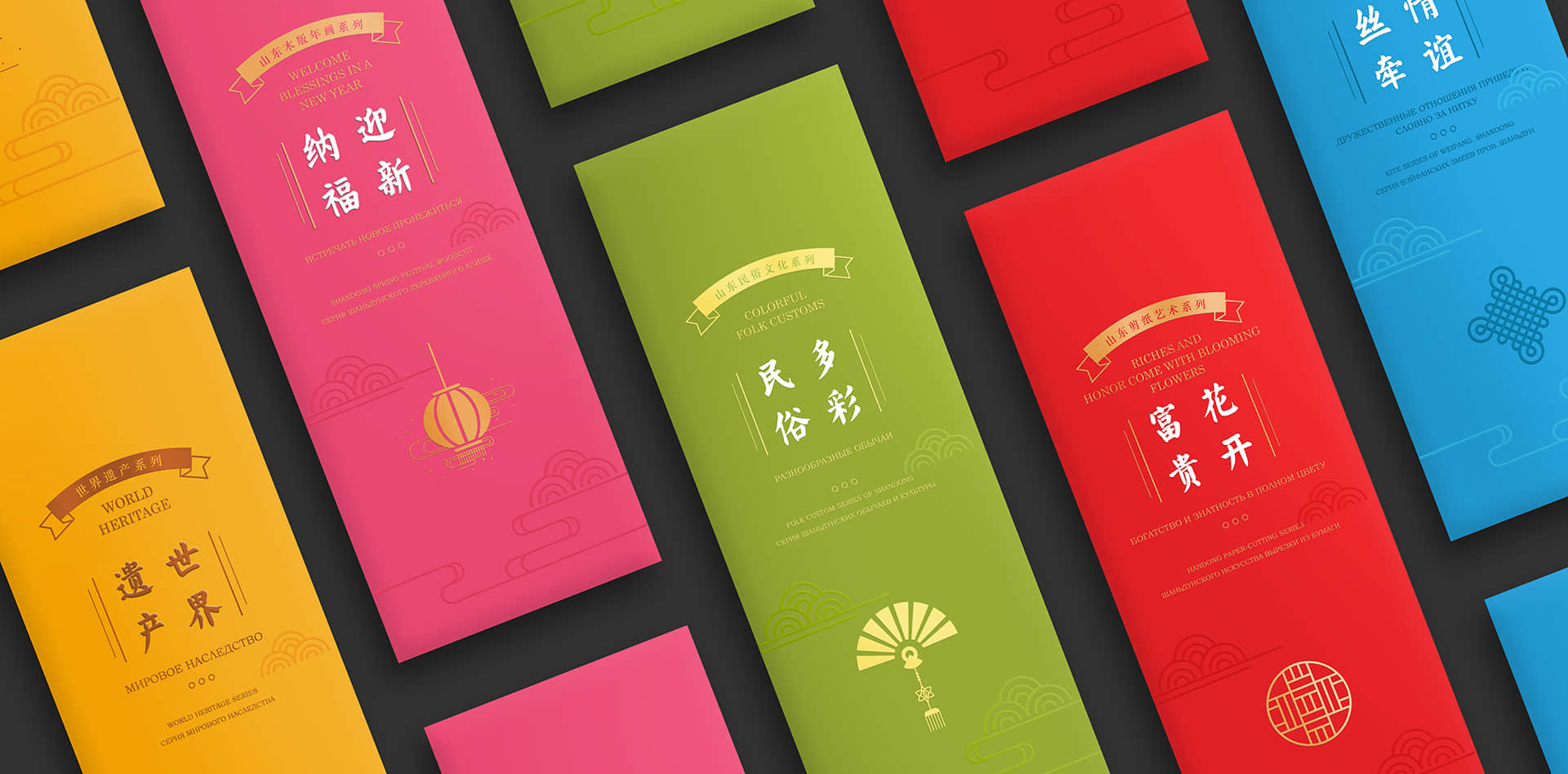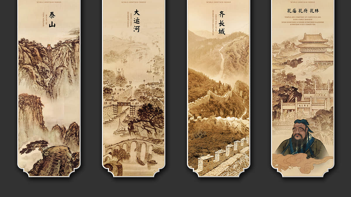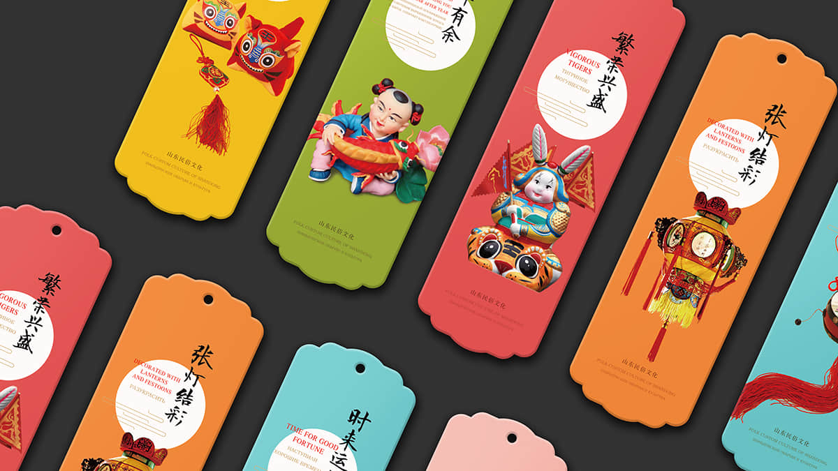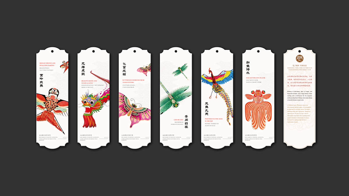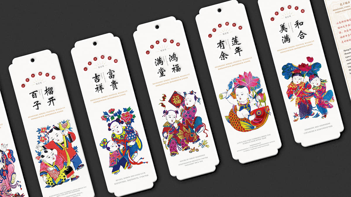 整套書簽總共分為世界遺產(chǎn)、迎新納福、多彩民俗、花開富貴和情誼絲牽五個(gè)系列,分別以世界遺產(chǎn)、山東木板年畫、山東民俗文化、山東剪紙藝術(shù)和山東濰坊風(fēng)箏為主題,每個(gè)主題的書簽分別配以一個(gè)中國紅包,在現(xiàn)代美學(xué)中融合古典元素,讓中國之美得以延續(xù)。