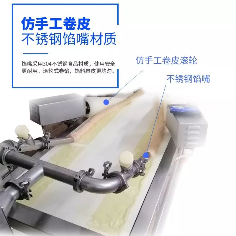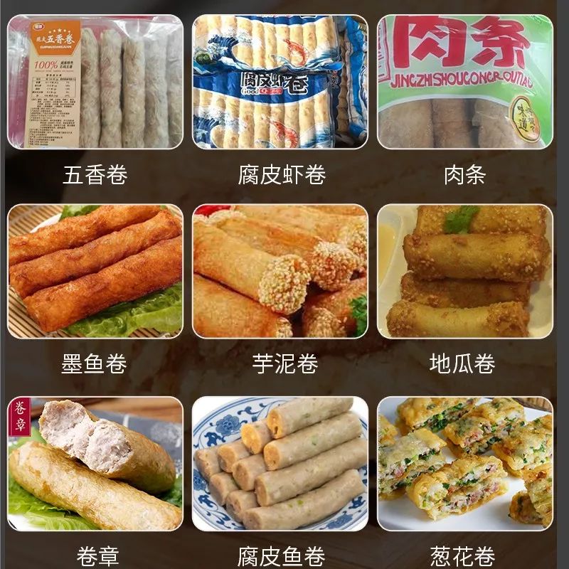 / 腐皮卷機(jī)是一款完全取代手工包各種腐皮類的機(jī)器,完全解決傳統(tǒng)手工包個種肉卷、卷章、魚卷、蝦卷、福建五香卷、潮汕肉條、腐皮蝦卷、墨魚卷、芋泥卷、地瓜卷等各種卷類食品。做出的各種卷類食品造型好看、長短均勻,葉片泵的供料機(jī)不破壞物料原有形狀,獨(dú)有的圓形收口切斷設(shè)計使其接近手工制作。全自動包漿、卷條、切斷成型,大大的提升了生產(chǎn)效率,滿足了批量化生產(chǎn)的速度要求。/